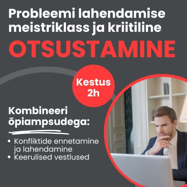 Kas arutelud kestavad kaua, kulgevad pingeliselt, kuid otsuseid sünnib vähe? Samad probleemid ilmnevad uuesti ja mustrid ei taha muutuda? See lühikoolitus õpetab meeskonda kasutama üht lihtsat raamistikku otsustamiseks ja probleemide...