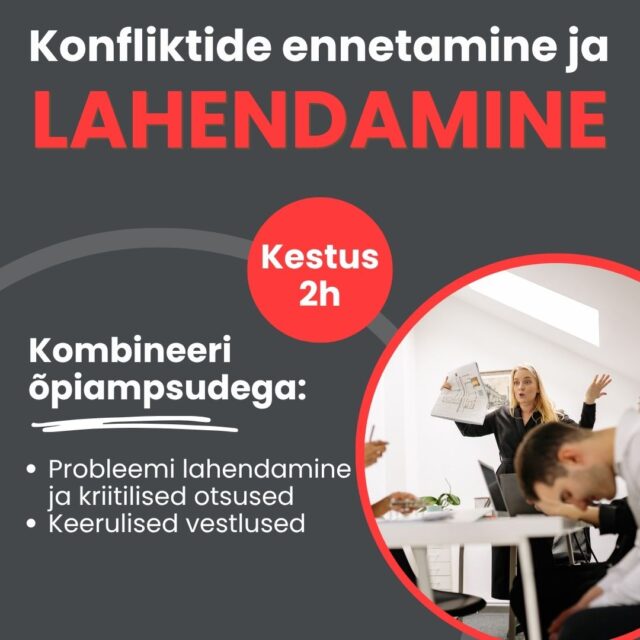 Kas pinged jäävad meeskonnas rääkimata ja kasvavad ajapikku konfliktideks? Selle praktilise lühikoolituse käigus õpitakse märkama konflikti varajasi märke ja lahendama erimeelsusi nii, et koostöö ja suhted säilivad.